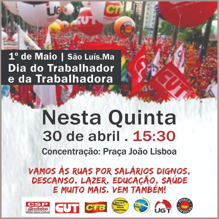 O Sindsep convoca a Direção, os Delegados Sindicais de Base e todos os servidores públicos federais para participarem de uma atividade em alusão ao 1º de Maio, Dia do Trabalhador. O ato será realizado nesta quinta-feira, 30 de abril, a partir das 15h30, na Praça João Lisboa, localizada no Centro de São Luís.